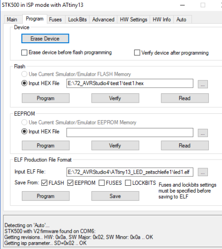 Das erste kleine Programm wurde soeben in den Speicher des ATtiny13A gebrannt.