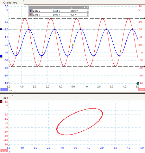 Bei einer Frequenz von 500Hz unterscheiden sich die Amplituden des Eingangs- und Ausgangssignals um den Faktor ca. 2; die Phasenverschiebung ist deutlich zu sehen. Auch dies wird von der Lissajous-Figur im unteren Bild bestätigt.