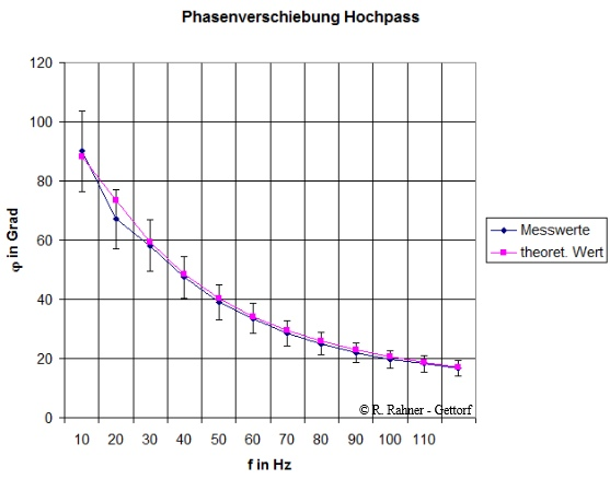 Bei den ersten Messungen aus RC Schaltung 1 - Übung 6 - Hochpass mit unterschiedlichen Kapazitätswerten des Kondensators und unterschiedlichen ohmschen Widerständen konnte die eintretende Phasenverschiebung zwischen der Aus- und Eingangsspannung beobachtet werden. Sie ergibt sich rechnerisch über die Formel (11).