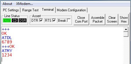 Jede Zeile der Registerkarte Modem Configuration beginnt mit zwei Zeichen; die beiden gerade vorgenommenen Änderungszeilen tragen zum Beispiel die Buchstabenfolgen DL (Destination Address Low) und MY (16-Bit Source Address) und stehen für sog. AT-Befehle, mit denen man ebenfalls Konfigurationseinstellungen Lesen und Änderungen kann. Dazu muss die Registerkarte Terminal aufgemacht werden.